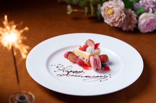 乾杯には、苺を添えたスパークリングワイン、またはノンアルコールスパークリングをご用意。華やかな一杯から特別な時間がはじまり、シェフが心を込めて仕上げるディナーコースをお楽しみいただきます。お食事の締めくくりには、本プランだけの特別なアニバーサリープレートを提供。大切な方からのメッセージを添えてお祝いいたします。