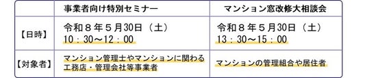 このたび、室内の暑さ・寒さ対策、冷暖房費削減、結露防止に効果があるマンションの窓改修に関する『事業者向けセミナー』と『居住者向け相談会』を開催します。