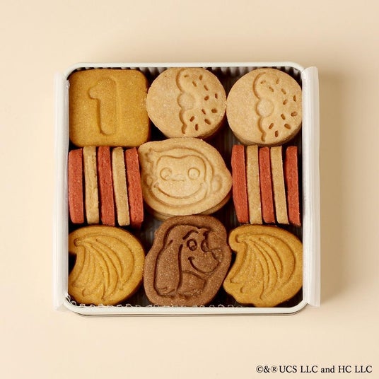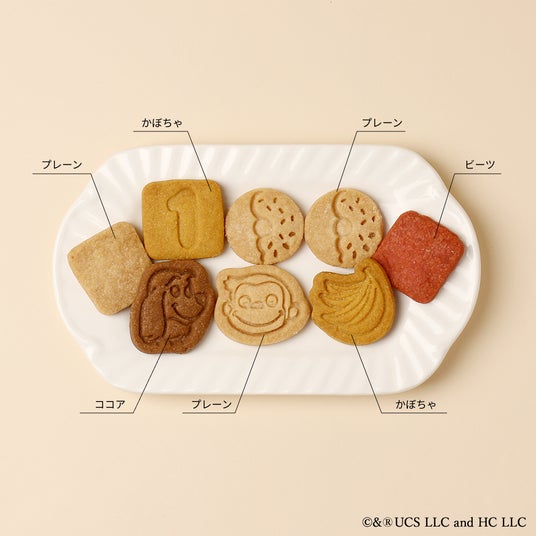 Cake.jpの「お子様もご家族もいっしょに美味しく召し上がってほしい」という想いから、『おさるのジョージ』とのコラボレーションが実現しています。原材料にもこだわり、中に入っているクッキーは「小麦・卵・乳」不使用です。小さなお子様に寄り添った商品を目指し、保存料、香料、着色料も使用しておりません。「ビーツ」「ほうれん草」「かぼちゃ」味のクッキーは、野菜パウダーを使用していますが、野菜が苦手なお子様も食べやすい味にしています。また、小さいお子様でも食べやすいよう、サクッとした食感にもこだわりました。