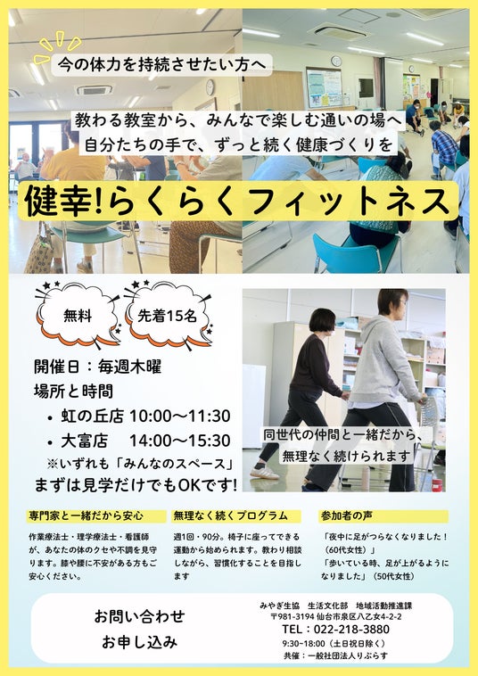 一般社団法人りぷらす(宮城県石巻市、代表理事:橋本大吾)は、みやぎ生活協同組合(本部:宮城県仙台市、代表理事理事長:冬木 勝仁)との協働により、専門職と一緒に作り上げていく健康教室「健幸!らくらくフィットネス」の2026年度プログラムを、5月7日(木)より虹の丘店、大冨店の2店舗にて開始いたします。