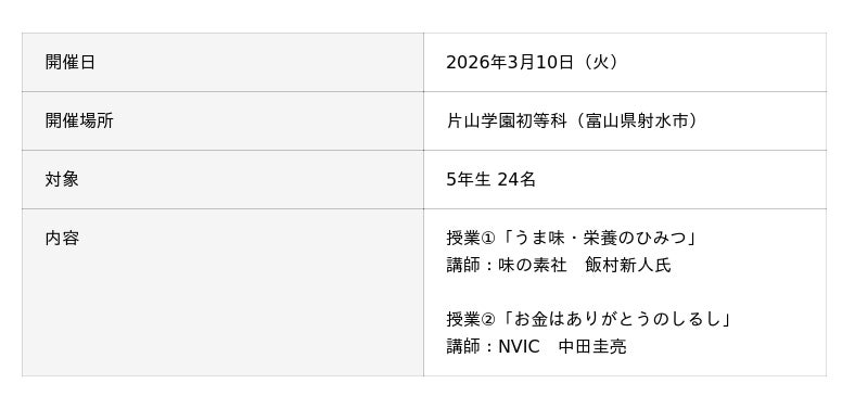 農林中央金庫グループの投資運用・助言会社である農林中金バリューインベストメンツ株式会社(以下「NVIC」)は、日本を代表する食品メーカーである味の素株式会社(以下「味の素社」)と協力し、2026年3月10日、片山学園初等科(富山県射水市)において特別授業を実施しました。本授業では、日常生活で身近な「食・栄養」を入口に、社会の仕組みやお金の意味を学ぶ金融教育プログラムを実施しました。子どもたちが「働くこと」「社会への貢献」「お金の役割」について手触り感をもって理解することを目的としています。