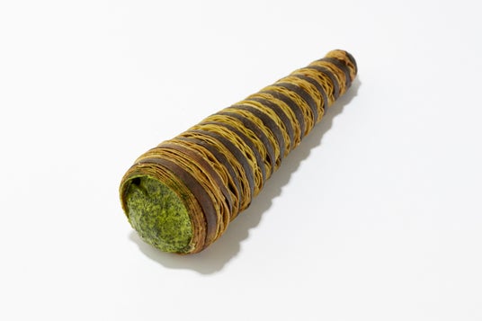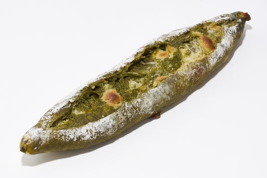 抹茶とホワイトチョコのバゲット ¥ 411スヴィンゴールド生地に抹茶とホワイトチョコを練りこみ焼き上げたマーブル模様バゲット。