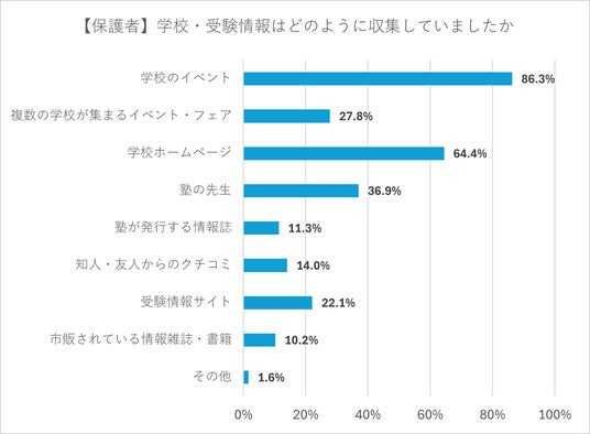 n=371、総回答数1019、複数回答方式(最大3つまで)保護者に、学校や受験情報をどのように収集していたか聞いたところ、「学校のイベント」が86.3%と最も多く、次いで「学校ホームページ」が64.4%となった。多くの家庭で、学校が発信する情報を活用していることが分かった。