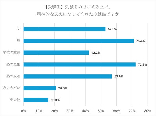 n=263、総回答数874、複数回答方式(あてはまるものすべて)受験生に、受験をのりこえる上で精神的な支えとなった人を聞いたところ、「塾の先生」が72.2%と最も高く、次いで「母」が71.1%だった。受験生にとって、周囲の大人が支えとなっていることが分かった。