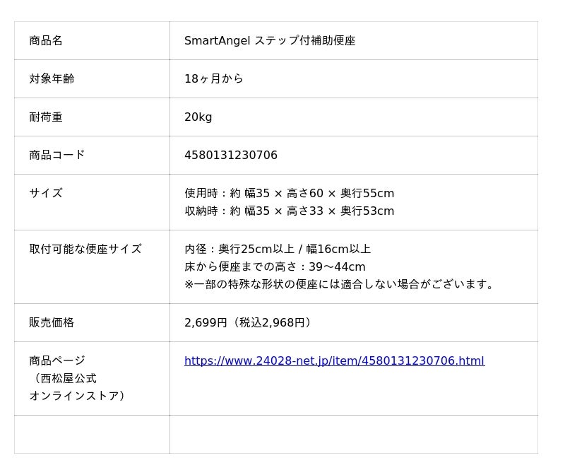 株式会社西松屋チェーン(兵庫県姫路市、代表取締役社長 大村 浩一)は、プライベートブランド「SmartAngel(スマートエンジェル)」の新商品として、「SmartAngel ステップ付補助便座」を全国の当社店舗および西松屋公式オンラインストアにて販売を開始いたしました。