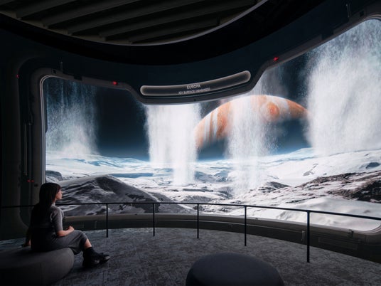 人類が歩んできた惑星探査による発見と、宇宙に広がる未踏の領域--。その両方を科学観測データと科学的知見に基づき、高精細なCGで没入型映像体験として提示。既踏から未踏の領域につなぐ「宇宙の旅」へ鑑賞者を誘います。鑑賞者は宇宙船のラウンジを模したシアター空間で、窓の外に広がる天体の景色や現象、そして未踏の世界と対峙します。旅のガイドを務めるのは、音楽家・青葉市子さん。壮大なスケールで眼前に広がる宇宙と対比し、一人ひとりの心へそっと寄り添うような声が、太陽、火星、木星および衛星エウロパ、そして太陽系外へと続く宇宙の旅を詩的に彩ります。