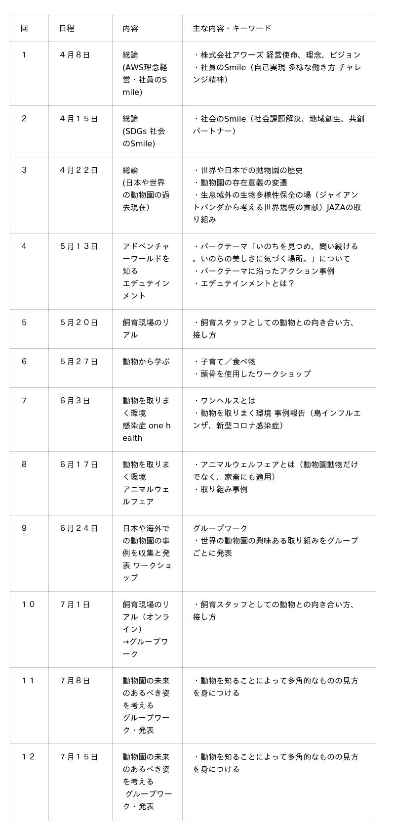 飼育の現場に注目し、来園客、展示動物、企業の間に立つ飼育スタッフの知恵、工夫、経験に焦点を絞ります。事例を踏まえ、受講生はそこから自らのアイデアを発展させ、問題解決に活用できる知識モデルの獲得を目指します。