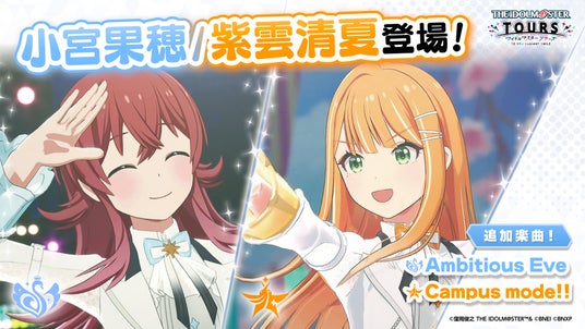 「アイドルマスター シャイニーカラーズ」より小宮果穂、「学園アイドルマスター」より紫雲清夏が『アイドルマスター TOURS』に登場し、『Ambitious Eve』・『Campus mode!!』の2曲を追加楽曲として収録します。また、第5弾注目の「小宮果穂/小宮果穂、参上!」・「紫雲清夏/ Campus mode!!」をはじめとする『アイドルマスター TOURS』オリジナルの描き下ろしイラストのカード90種の払い出しを開始します。