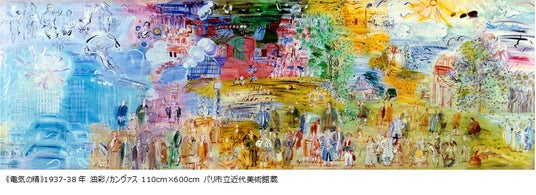 本展はデュフィの生誕150年を記念し、その全貌を、パリ市立近代美術館が所蔵する多数の作品を中心に紹介します。中でも、1937年のパリ万国博覧会のために制作された巨大フレスコ画《電気の精》の原画となる、10分の1スケールの貴重な絵画(幅6メートル)は必見です。