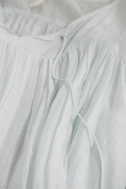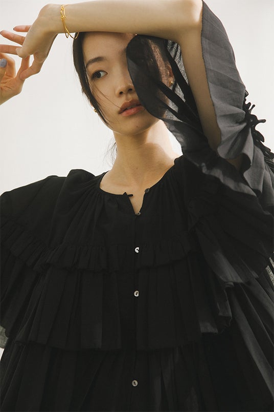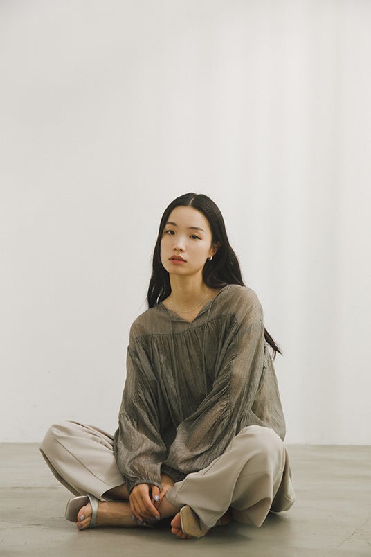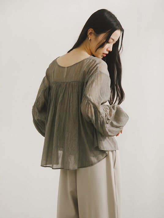 ムラ染め感や楊柳のシワが雰囲気を出してくれるニュアンスブラウス。袖と胸下に切り替えたたっぷりのギャザーがふんわり女性らしさを演出してくれます。裏の縫製がすべてパイピング仕立てとなっており、肌にも優しいこだわりのつまったブラウスです。