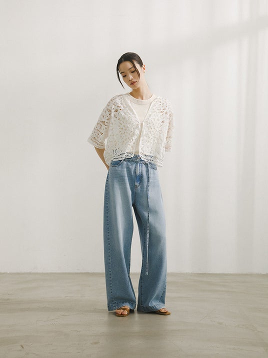 夏でも涼しく着用していただける、爽やかな落ち感のあるライトデニム。ウエストはベルト付きのデザインでスタイル良く見え、サイドラインの切り替えが前振りになっているためすっきりと細見えするデザインが特徴です。ポケットの形やサイズ感などにもこだわった1着。