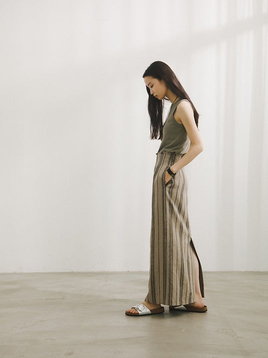 ランダムなストライプ柄で存在感が出る、オリジナル生地と柄で作ったリネン100%のストライプIラインスカート。すこしかすれ気味の先染めのストライプ柄が抜け感を演出してくれます。ウエストは共布のフリンジデザインで、すっきりとそして可愛く見える仕様です。