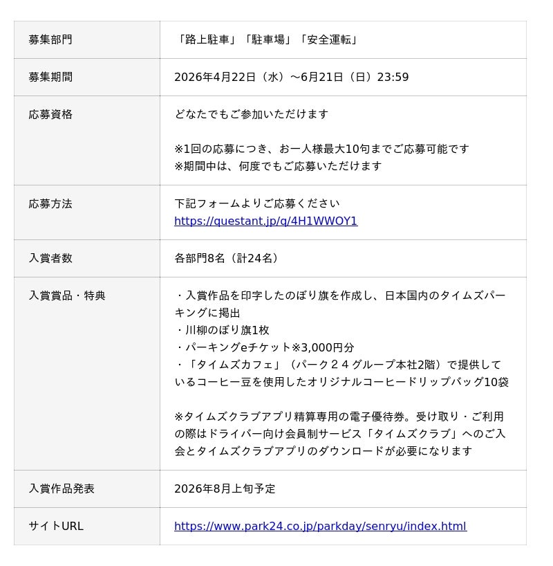 パーク24株式会社(本社:東京都品川区、社長:西川光一、以下「パーク24」)は、路上駐車ゼロに向けた啓発活動として、第1回「パークの日」川柳コンテストを開催します。