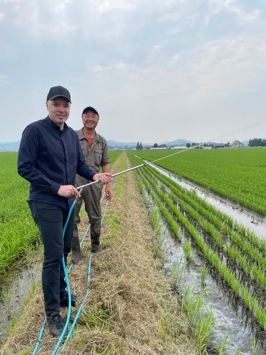 マイクロバイオーム農法で酒米「吟風」を生産する安友さんとシェニョンシェフ