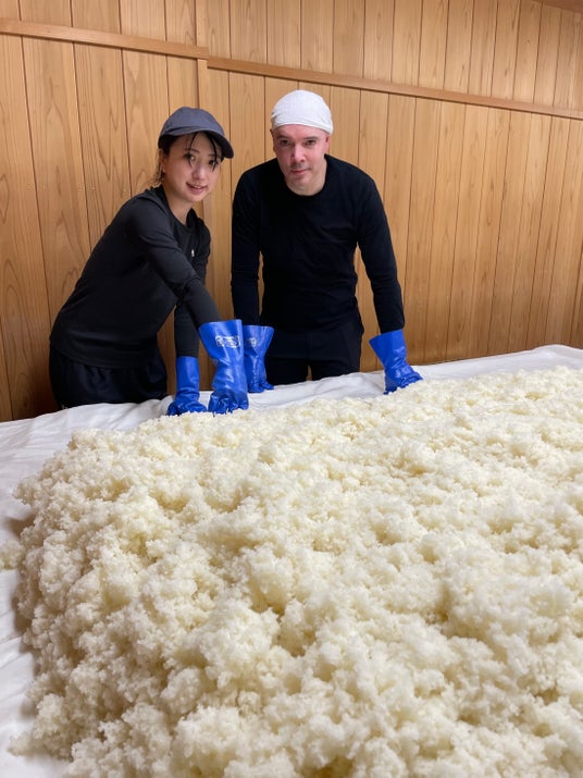 麴造りをする富久千代酒造の飯盛さんとシェニョンシェフ