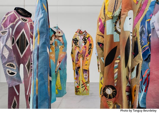 今回の展示では、フランス・パリを拠点に活動する現代アーティスト、マティルド・ドゥニーズとのコラボレーション作品を発表。ドゥニーズは廃棄されたオブジェクトや自身の過去の絵画、映画のセットや広告制作の現場から回収した塗料などを用いて構成される「コスチューム・ペインティング」と呼ばれる手法で知られています。