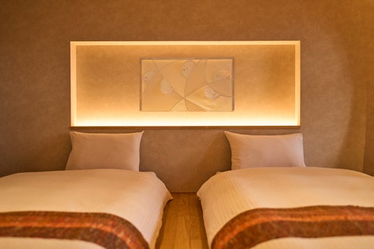 ベッドボードには、県花でもあるりんごの花びらをモチーフとした、りんご和紙でできた壁掛けが空間を彩ります。ほんのりとピンク色を帯びた可憐な花を2種類のりんご和紙を用いて表現しました。剪定されたりんごの枝を粉砕して漉き込んだ和紙は、一つひとつ異なる表情の模様を生み出し、その独特な模様とやさしい風合いが重なり合うことで、手仕事ならではの温かみのある趣を醸し出します。
