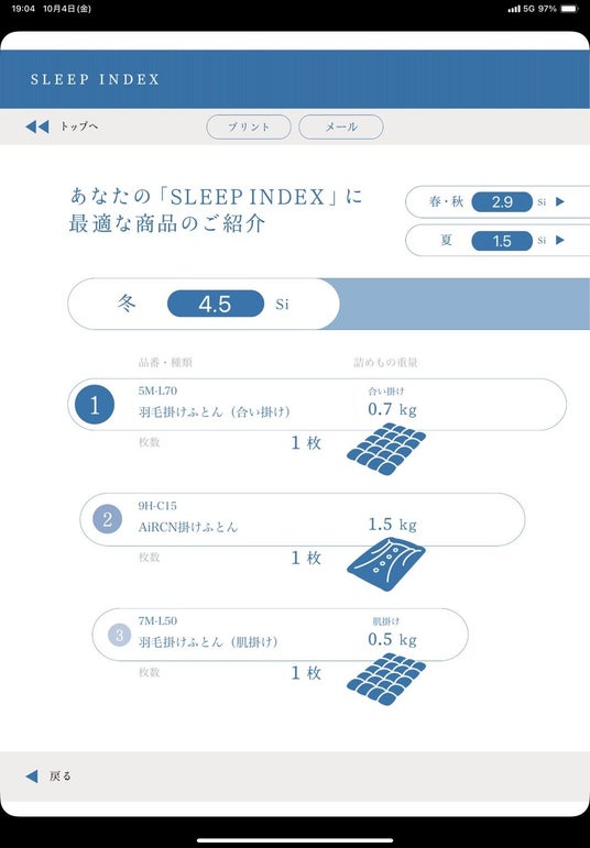 掛けふとんデジタル診断ツール「スリープインデックス」では、お客様の基礎代謝量と寝室環境のパーソナルデータを入力いただくと、季節ごとの眠りの快適指数「Si」を算出し、お客様一人ひとりに合った「掛けふとん」を提示します。店頭では、診断結果を基に見合う商品をご提案します。