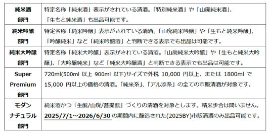 純米酒 部門・純米吟醸 部門・純米大吟醸 部門・Super Premium部門・モダンナチュラル 部門の全5部門で審査を行います。各部門の出品基準はラベル表記を基本としますが、ホームページなどで確認できる場合でも出品可能です。2025年7月1日から2026年6月30日までの期間に販売実績があるか、または販売予定のある清酒に限ります。販売予定商品につきましては、2026年4月10日までに発売日に関わらず、「商品名」や「ラベル」などの外見を含めて完成していることが出品の条件です。各部門の出品条件は以下の通りです。