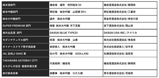純米3部門(純米酒/ 純米吟醸 /純米大吟醸 )の中からその勢いとは裏腹に、出荷量に限りがあり国内でも希少性の高いお酒に対して、海外の方にも是非知ってもらいたいという視点で選定。期間限定で日本航空の国際線ビジネスクラスで採用する予定です。
