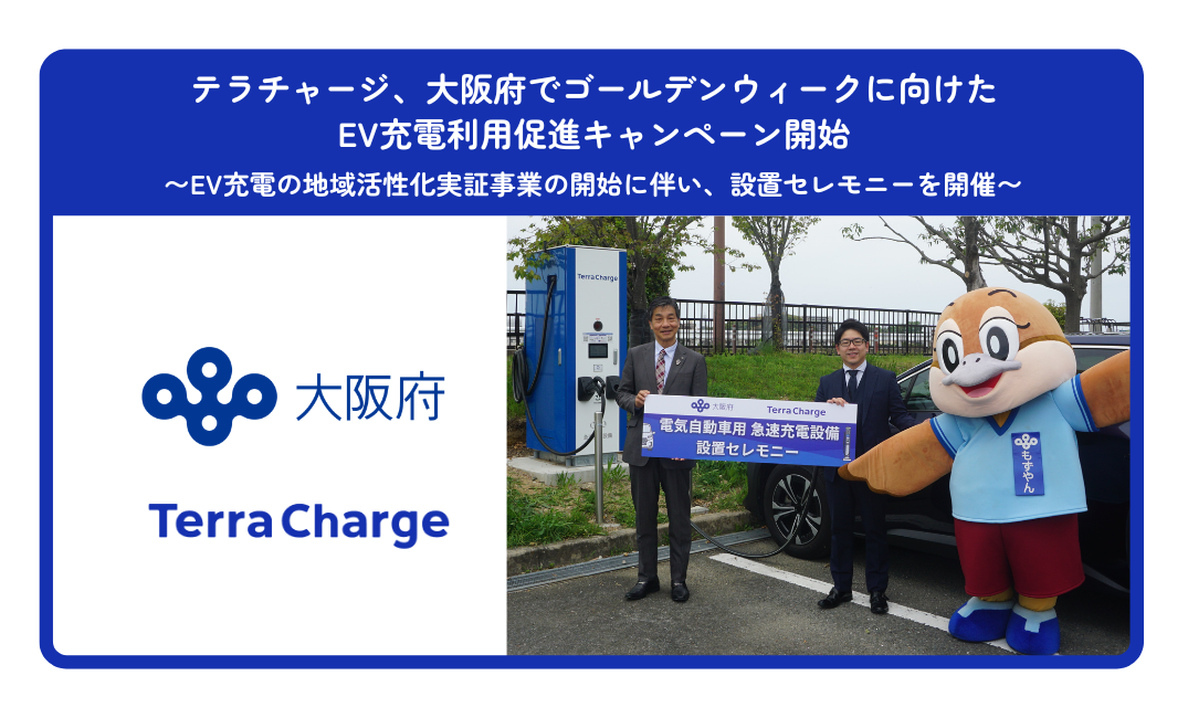 EV(電気自動車)向け充電サービス「Terra Charge(テラチャージ)」を展開するTerra Charge株式会社(本社:東京都港区、代表取締役社長:徳重徹、以下「当社」)は、4月20日(月)大阪府内の公共施設・公園等に設置されたEV充電設備において、地域経済の活性化とEV普及促進を目的とした「地域充電クーポン」活用施策を令和8年度限定で実施するとともに、ゴールデンウィークに向けたEV充電利用促進キャンペーンを開始いたしました。
