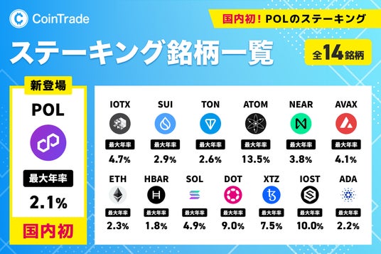 株式会社マーキュリー(本社:東京都渋谷区 代表取締役社長:都木 聡、以下、「当社」)は、当社の提供するステーキングサービス「CoinTradeStake(コイントレードステーク)」において、国内初※の取り扱いとなるポリゴン(POL)のステーキングを2026年4月22日に開始することをお知らせいたします。これにより暗号資産販売所「CoinTrade(コイントレード)」では25種類の暗号資産を取り扱い、「CoinTradeStake(コイントレードステーク)」では14種類の暗号資産のステーキングが可能となります。