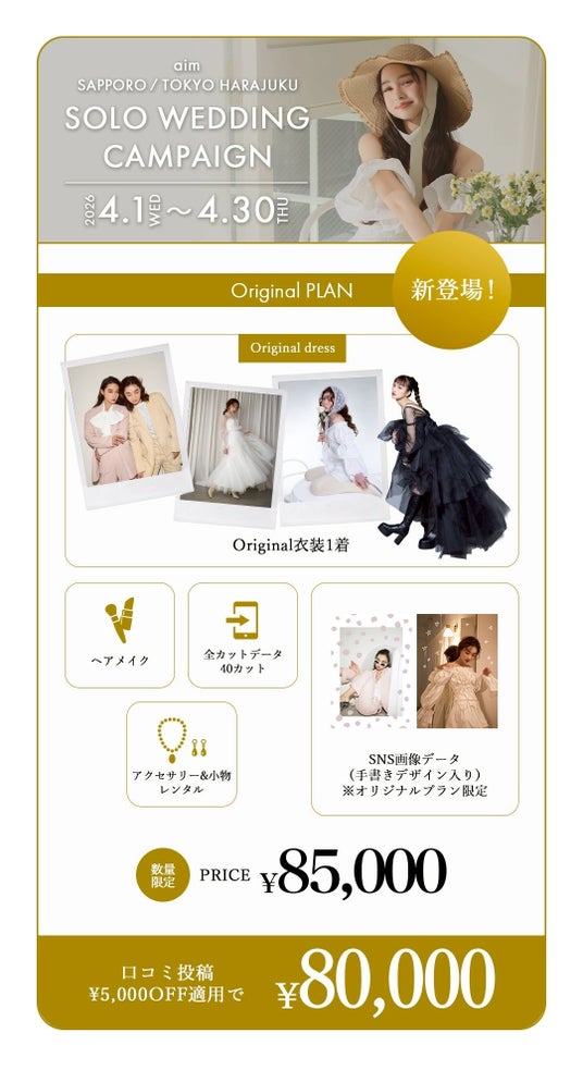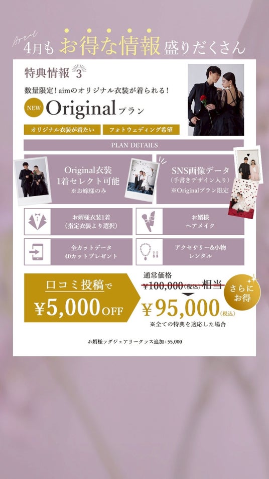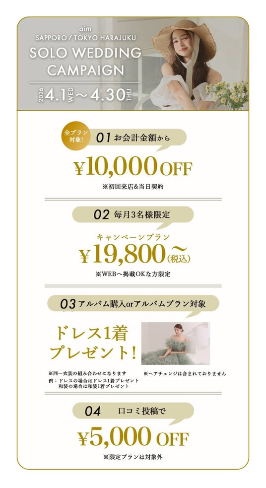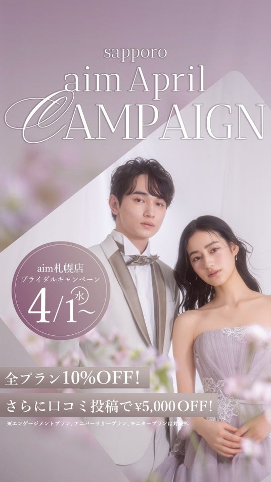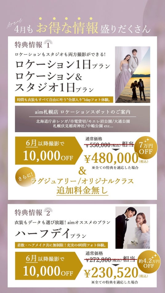 北海道札幌市のウエディングフォトスタジオ、aim札幌店の4月のキャンペーン情報をお届けいたします!フォトウェディングの際のお得情報やソロウェディングキャンペーンもご紹介をしております。