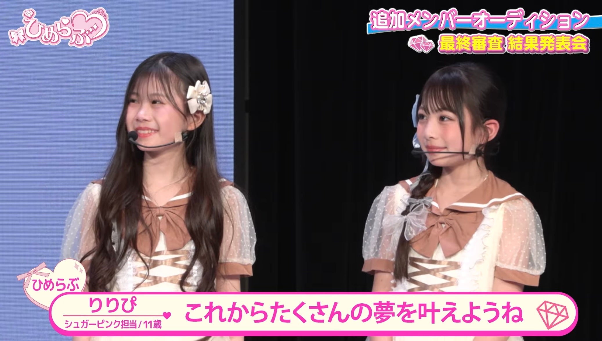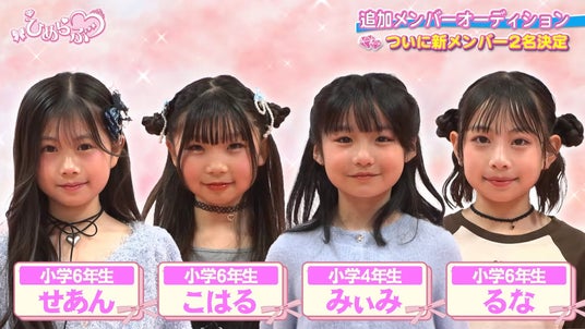 小学生プリンセスアイドルグループ「ひめらぶ」(メンバー:ラリッサ、ましろ、りりぴ、かんな、あやな)の追加メンバーオーディションの最終結果が発表され、新メンバーとして 「せあん」(小学6年生) と 「るな」(小学6年生) の2名が選出されました。今後、ひめらぶは7人体制での活動をスタートします。