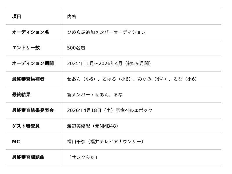 審査期間中にはゲスト審査員として朝長美桜(元HKT48)、高城亜樹(元AKB48)が参加。ナレーターにはあいさ(eggモデル)が起用されるなど、業界内外から大きな注目を集めるオーディションとなりました。最終結果は、審査期間を通じた成長度合い、ひめらぶメンバーとの関係性、パフォーマンスを総合的に評価して決定されています。