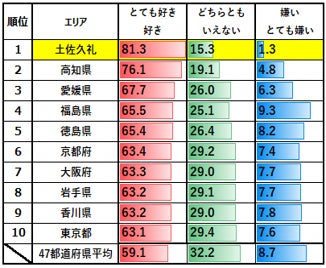 ●「とても好き+好き」の割合全国トップ10