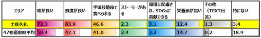 ●『普段、どのくらいの頻度で「かつお」を食べますか?』という問いに対し、「毎日+週1回程度」と答えた割合が、土佐久礼(39.9%)は47都道府県平均(5.4%)と比べて非常に高い。また、「毎日」が土佐久礼(4.9%)で同平均(0.9%)の約5.4倍になる。よって、「土佐久礼は、超高頻度のかつおヘビーユーザー地域である。」と分析できる。