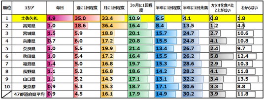 ●「毎日+週1回程度」が、高知県(19.6%)が平均(5.4%)と比べて非常に高いが、土佐久礼(39.9%)はさらに高く、47都道府県平均を大きく上回る超高頻度のヘビーユーザー地域である。あわせて、「毎日」が土佐久礼(4.9%)で平均(0.9%)の約5.4倍、高知県(1.0%)の4.9倍である。また総務省家計調査(※2)で日本一のかつお消費量を誇る高知市を抽出調査したところ、「毎日」が0.5%、「毎日+週に1回程度」が22.0%であり、こちらも上回っている。●かつお摂取頻度は「月1回~半年に1回未満」がボリュームゾーンで、「毎日」は1%前後にとどまる都道府県が多い。