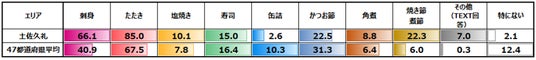 ●好きな食べ方では、全国的に「刺身」「たたき」が上位、「かつお節」「缶詰」などの加工品は二番手以降という構図が多くの県でみられる。そのなかでも、土佐久礼では、「刺身」66.1%、「たたき」85.0%と複数項目で全国トップ、一方で「かつお節」が全国最下位となっており、土佐久礼のかつお食文化は、刺身+たたきといった生食が核になっている。これは、一本釣り漁の町ならではといえるだろう。また、この生食の傾向は高知県も同様で、「刺身」49.8%、「たたき」81.5%となり高い値になっている。●土佐久礼は「その他」も多く、こだわりある様々な食べ方でかつおを楽しんでいることがうかがえる。