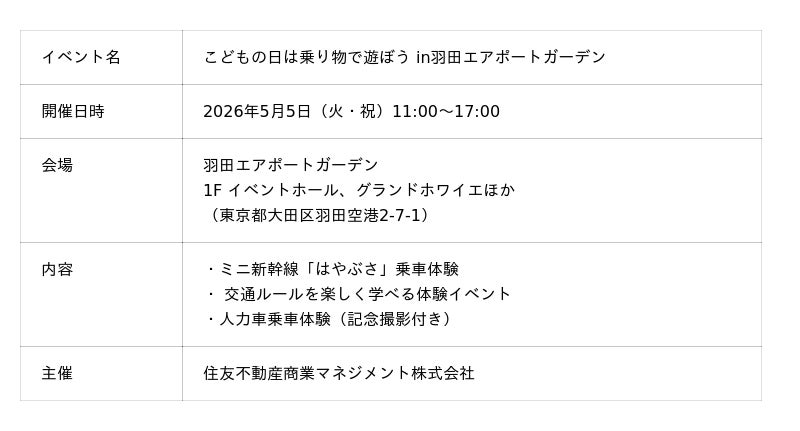 住友不動産商業マネジメント株式会社(本社:東京都新宿区/代表取締役社長:山本直人)が運営する、羽田空港第3ターミナル直結の複合施設「羽田エアポートガーデン」(所在地:東京都大田区)は、2026年5月5日(火・祝)のこどもの日にあわせ、ファミリーで楽しめるGWイベントを開催いたします。