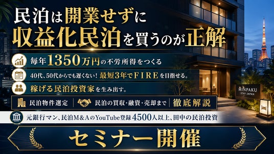 株式会社ファイナンスアイ(本社:大阪府、代表取締役:田中琢郎)は、すでに収益を生んでいる民泊事業を購入する民泊投資を教え、これまで多くの『儲かる民泊投資家』を育成してきました。『会社員の副業や公務員でも、40代・50代でも遅くない、お金を働かせて最短3年でFIRE!年間1,350万円の不労所得を目指せる、銀行評価目線で投資先を選ぶ。収益化済み稼げる民泊投資よる資産形成セミナー(オンラインZOOM/大阪会場の同時開催)』を、2026年5月2日(土)13時30分に開催します。