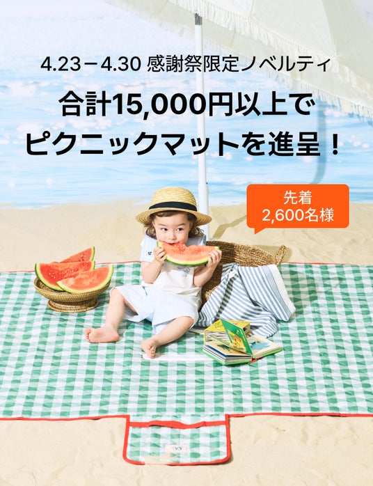 8日間限定、コニー感謝祭恒例、初購入者スタイ1枚目100円クーポンの他、出産準備セットやスタイ福袋が特別価格で登場!ノベルティプレゼントも実施。4月25日にはオフラインイベントも開催!