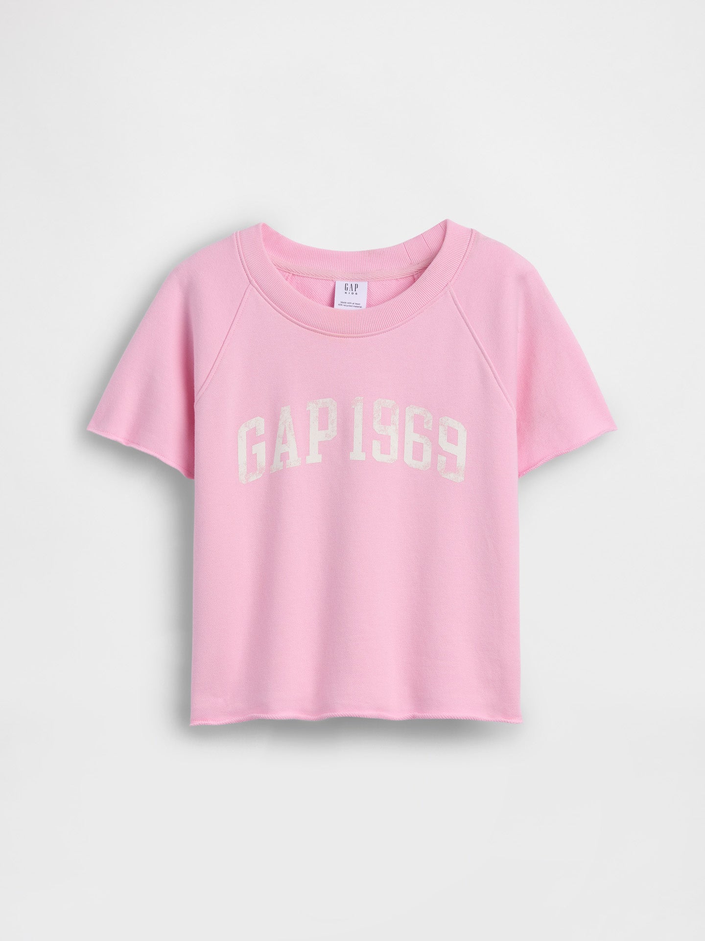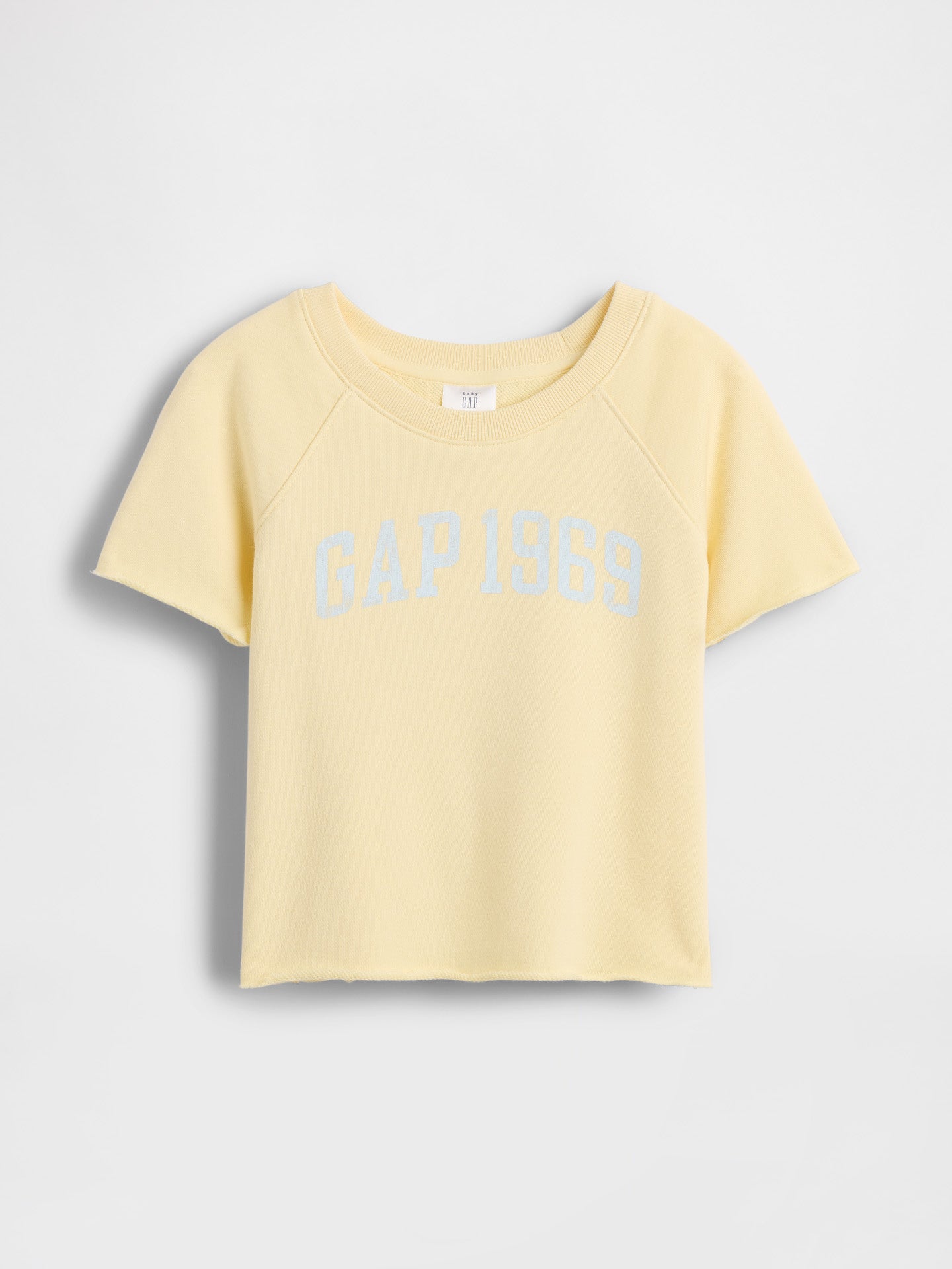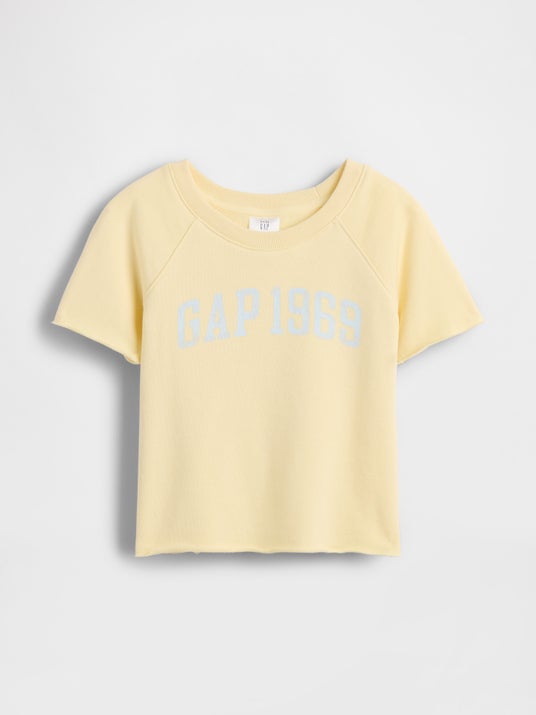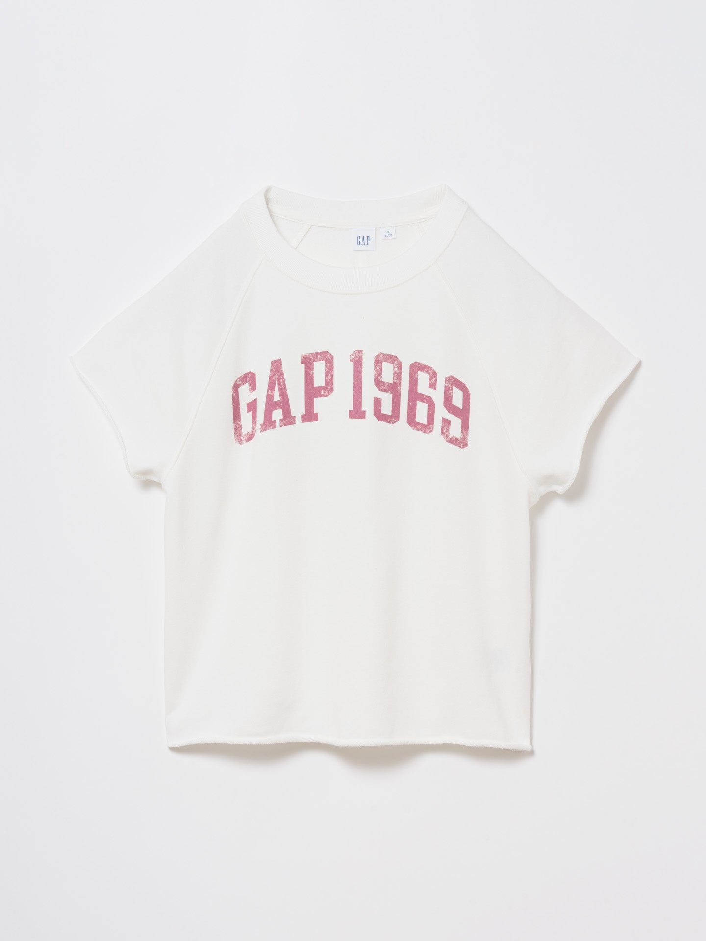 ロゴスウェットシャツ: ラグランスリーブのゆったり目シルエットにカットオフのディティールが付いた半袖スウェットシャツ