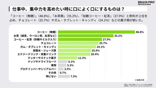 集中力を高めたい時によく口にするものとして、「コーヒー(無糖)」(48.8%)が最多、次いで「お茶類」(35.2%)、「加糖コーヒー・紅茶」(27.9%)や「チョコレート」などの菓子類が上位を占めました。