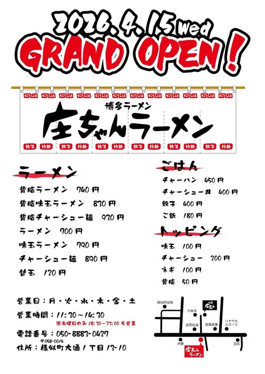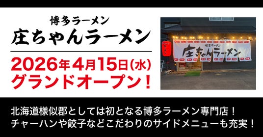 世界10カ国90店舗以上を展開するラーメンのグローバルブランド、博多一幸舎や幸ちゃんラーメンを運営する、株式会社ウインズジャパンホールディングス(所在地 福岡県福岡市博多区、代表取締役社長 吉村 幸助 以下当社)は、株式会社庄田ファーム(所在地 北海道様似郡様似町、代表 庄田 匡希)とプロデュース契約を結び、「庄ちゃんラーメン」で提供されるラーメンのプロデュースを行いました。「庄ちゃんラーメン」は、北海道様似郡初の博多ラーメン専門店として2026年4月15日(日)にグランドオープンいたしました。北海道様似郡のお近くにお越しの際は、是非、本場博多の豚骨ラーメンをお楽しみください!
