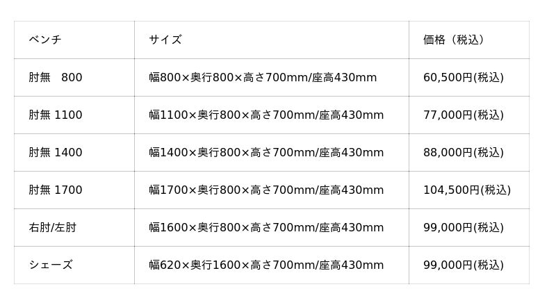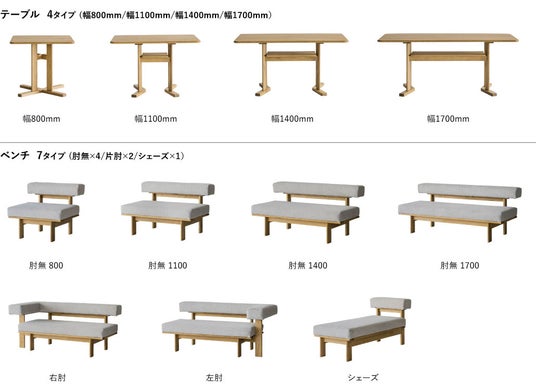 テーブル4サイズ、ベンチ7タイプをラインナップ。肘無ベンチはテーブル天板と同幅の設計のため、同幅で合わせるとすっきりまとまります。また、シェーズ(長椅子)タイプもご用意。足を伸ばしてくつろげます。