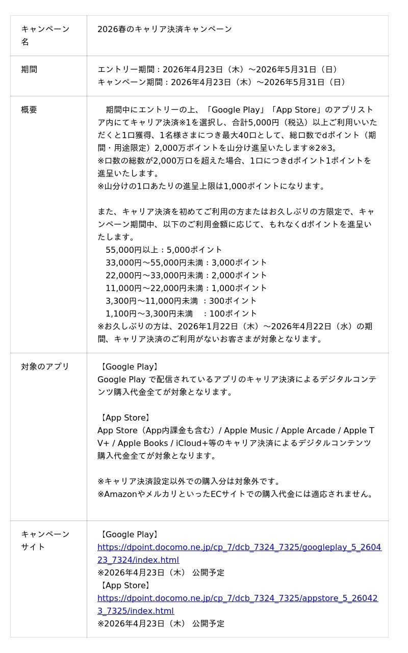 株式会社NTTドコモ(以下、ドコモ)は、「Google Play」「App Store」のアプリストア内にてドコモのキャリア決済※1を期間中合計で5,000円(税込)以上ご利用いただくとdポイント(期間・用途限定)2,000万ポイントを山分け進呈する※2※3「2026春のキャリア決済キャンペーン(以下、本キャンペーン)」を4月23日(木)から2026年5月31日(日)まで開催いたします。
