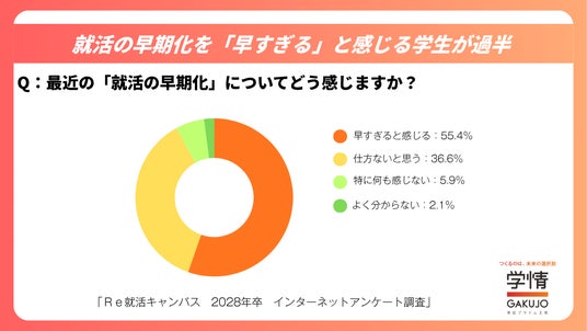 「最近の就活の早期化についてどう感じるか」を尋ねた結果、「早すぎると感じる」と回答した学生が多く見られました。