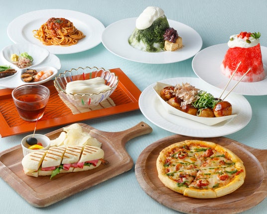 隣接するプールサイドレストランでは、メニューを刷新し、「スパゲティ ミートソース」や「オークラ特製ビーフカレー」などのランチメニューをはじめ、素麺や揚げたこ焼きなどの軽食、さらに練乳のエスプーマを添えたかき氷まで、バラエティー豊かなラインアップを揃えています。