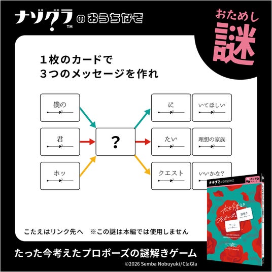 札幌市にあるボードゲーム・謎解きゲームのメーカー・出版社であるClaGla(クラグラ)は、謎解きゲーム『たった今考えたプロポーズの謎解きゲーム』を2026年5月23日(土)に発売いたします。
