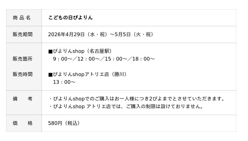 ジェイアール東海フードサービス株式会社(本社:愛知県名古屋市、代表取締役社長:岩下賢一)は、人気スイーツ「ぴよりん」の限定商品として、「こどもの日ぴよりん」を2026年4月29日(水・祝)から5月5日(火・祝)までの7日間限定で販売いたします。毎年人気を集めるこの時期限定のぴよりんが、今年もこどもの日に合わせた特別仕様で登場します。愛らしい見た目とともに、この時期だけの限られた出会いをぜひお見逃しなく。