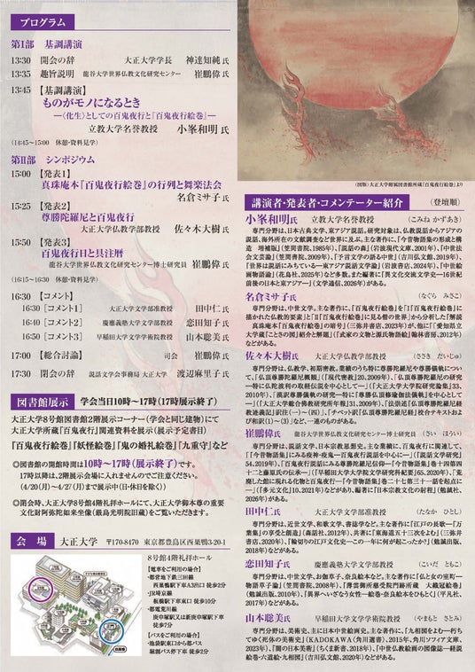 大正大学(学長:神達知純、所在地:東京都豊島区)は、2026年4月25日(土)に大正大学創立百周年記念慶賛、説話文学会2026年度4月例会として「百鬼夜行説話と百鬼夜行絵巻」を開催します。