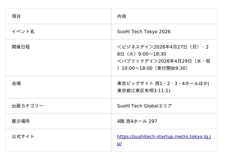 当社は、医学的エビデンスに基づき病気を治療する「治療アプリ」のパイオニアとして、これまでに禁煙、高血圧、減酒といった領域で薬事承認から保険適用、販売まで実現してまいりました。当社は国内外の自治体、企業、医療関係者、そして次世代のテクノロジーに関心を持つ来場者の皆様に、デジタル療法の現在地と今後の可能性を広く認知いただくことを目的として「SusHi Tech Tokyo 2026」に出展いたします。さらに新たなビジネスパートナーの開拓や、グローバルなネットワーク構築を目指します。