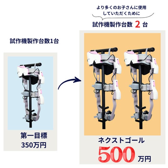 当初の目標達成により試作機1台の製作が可能となりましたが、「使ってみたい!」というお問い合わせも多数いただいていることから、より多くの子どもたちに届けるため、ネクストゴールとして500万円を設定いたしました。ネクストゴールを達成することで、試作機を2台製作することが可能となり、以下のような効果が期待されます。