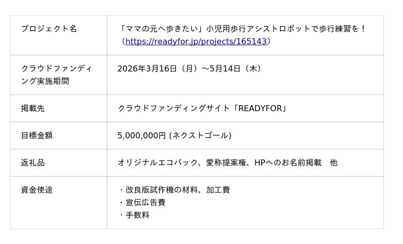【「小児用歩行アシストロボットの開発」クラウドファンディング概要】