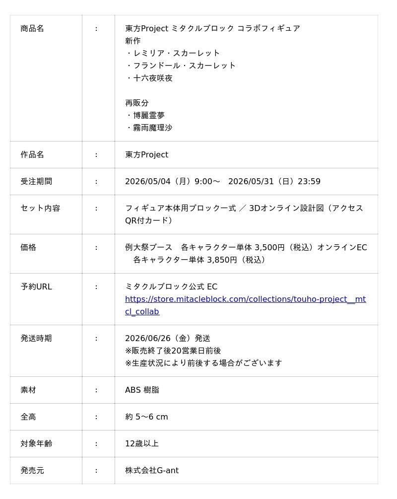 株式会社G-ant(所在地:東京都中央区、代表取締役:平川 彰悟)は、2026年5月4日(月・祝)に東京ビッグサイト東ホールで開催される「令和八年(第二十三回)博麗神社例大祭」において、企業ブース231「ミタクルブロック」に出展し、ボクセル技術を活用した組み立てフィギュア「ミタクルブロック」の東方Projectコラボ商品(全5種)を販売することをお知らせいたします。販売は、例大祭会場の企業ブース231にて当日数量限定(税込3,500円)で実施するとともに、公式ECサイトでは受注生産販売(税込3,850円)を2026年5月4日(月・祝)より同時に開始いたします。